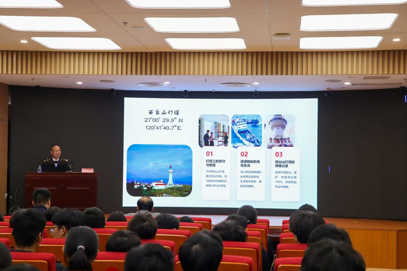互動環節結束后,福州航標處馮振剛老師從航海專業的角度用形象生動的案例向在場觀眾詳細介紹了航標處的運作情況。他指出要把在課堂上學到的理論與實際相結合,要大力弘揚勞模精神、勞動精神、工匠精神,不斷提升自身技術技能水平,以適應科技革命和產業變革的需要,為實現中華民族偉大復興的中國夢貢獻自己的青春力量。