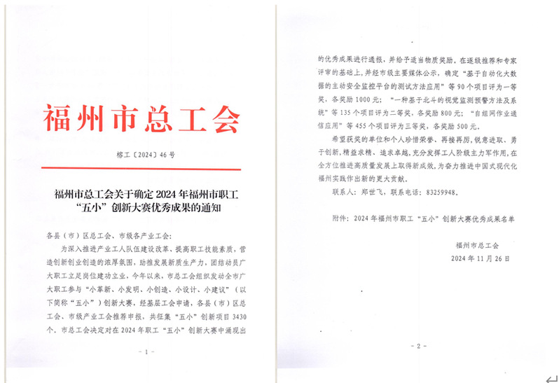 近日,福州市總工會公布《關于確定2024年福州市職工 “五小”創新大賽優秀成果的通知》,我院鄒澤昌勞模和工匠人才創新工作室報送的創新成果榮獲一等獎2項、二等獎1項、三等獎2項。