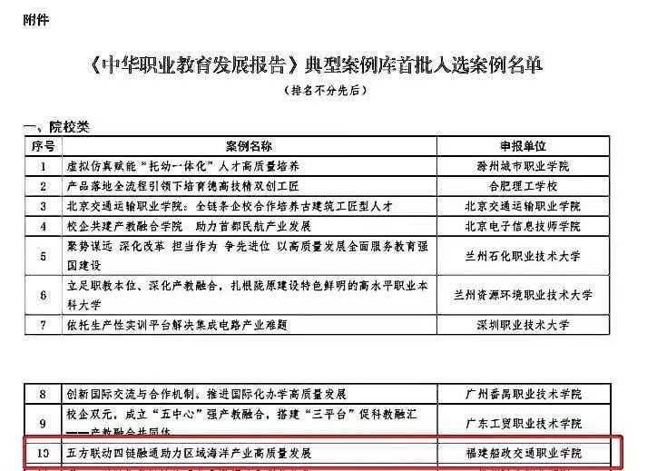 近日,中華職業教育社公布了《中華職業教育發展報告》典型案例庫首批入選案例名單,我院報送的《五方聯動四鏈融通助力區域海洋產業高質量發展》案例成功入選。
