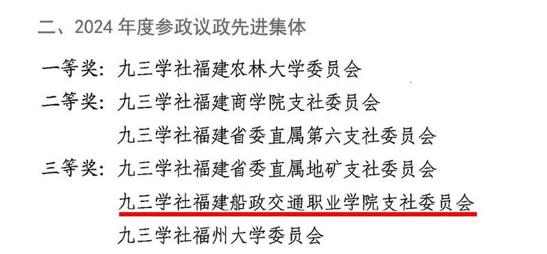 近日,九三學社福建省委員會直屬工作委員會表彰2024年度各項社務工作先進集體和先進個人,九三學社福建船政交通職業學院支社委員會榮獲2024年度參政議政先進集體三等獎,支社主委鄒澤昌、副主委陳樂天榮獲2024年度優秀社員。