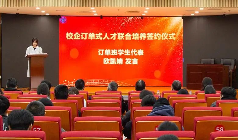 訂單班學生歐凱婧發言,她表示將珍惜訂單班學習的機會,以行業需求為導向,扎實學習監測技術,踐行環保責任,以專業能力服務生態治理,為生態文明建設貢獻青春力量。