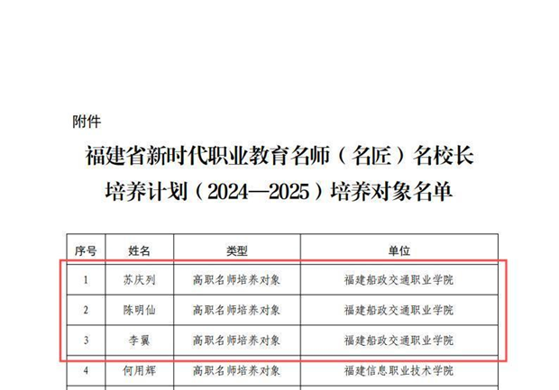 根據《福建省教育廳關于公布福建省新時代職業教育名師(名匠)名校長培養計劃(2024-2025)培養對象名單的通知》,我院?蘇慶列?、?陳明仙?、?李翼?三位教師成功入選福建省高職院校名師培養對象?。