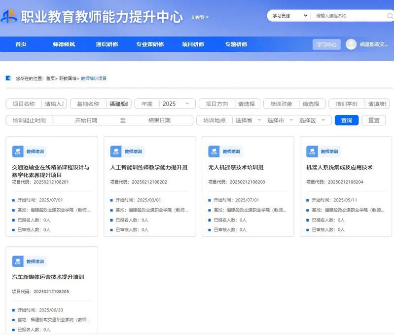 近日,教育部教師工作司公布 2025 年國家級職業教育教師培訓項目評審結果,我院交通運輸類國家級“雙師型”教師培訓基地牽頭申報的5個項目全部入選。項目涵蓋無人機遙感技術、交通運輸業在線精品課程設計、汽車新媒體運營、人工智能訓練師教學能力、機器人系統集成及應用技術等前沿領域,彰顯了我院在職業教育師資培養方面的實力與前瞻性布局。