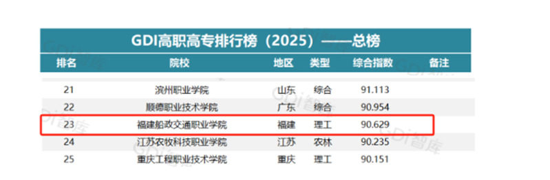 近日,GDI智庫發布“GDI高職高專排行榜(2025)”,對全國1560所高職院校(不含香港特別行政區、澳門特別行政區和臺灣地區院校)進行科學評價。我院綜合排名位列總榜第23位,省內綜合排名位列第一。