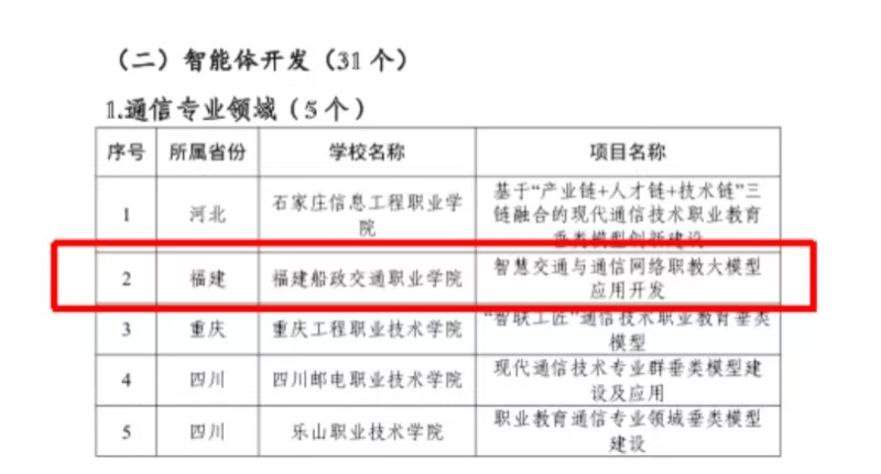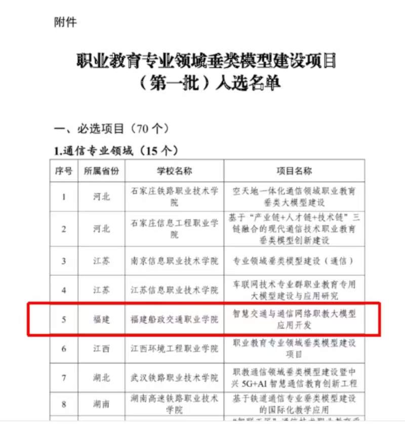 近日,教育部職業教育發展中心公布了“職業教育專業領域垂類模型建設項目(第一批)”入選名單,由我院信息與智慧交通學院團隊申報的“智慧交通與通信網絡職教大模型應用開發”項目成功入選,成為通信專業領域重點建設項目之一。